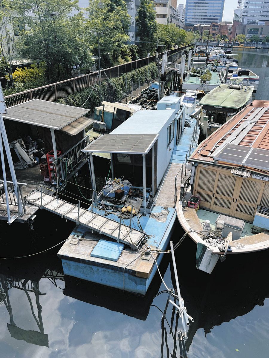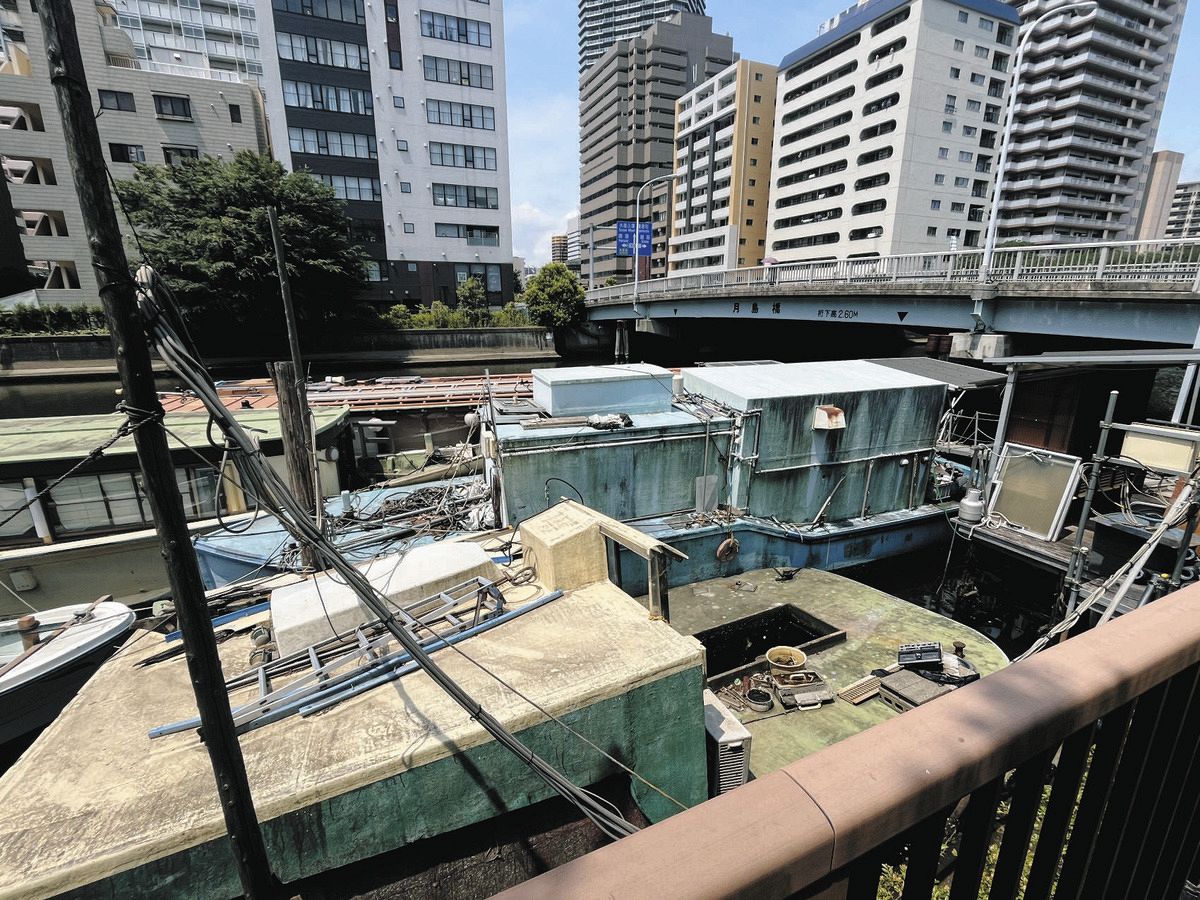 「旧日本海軍の15メートル内火艇(エンジン式ボート)では」。月島橋のたもとに浮かぶ水色の廃船を巡って、船体の特徴からネット上では近年そんなうわさが駆け巡る。もともとは屋形船の浮桟橋として活用されていたが、コロナ禍で屋形船が廃業。現在は他の船数隻と共に、ほとんど管理されない状態になっている。
