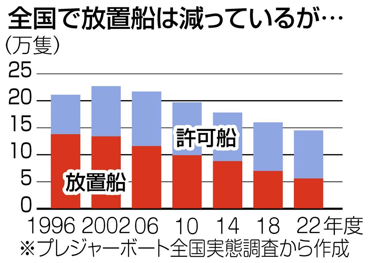 国は13年、大震災を教訓に22年度末までに全国で放置船を「ゼロ」にする目標を掲げた。強制撤去も視野に放置禁止区域を拡大すると同時に、保管場所を増やすなどの対策を進めた。放置船は減ったが、22年度の国の実態調査では、全国の港湾や漁港、河川の放置船は約5.6万隻に上り、ゼロには程遠い。