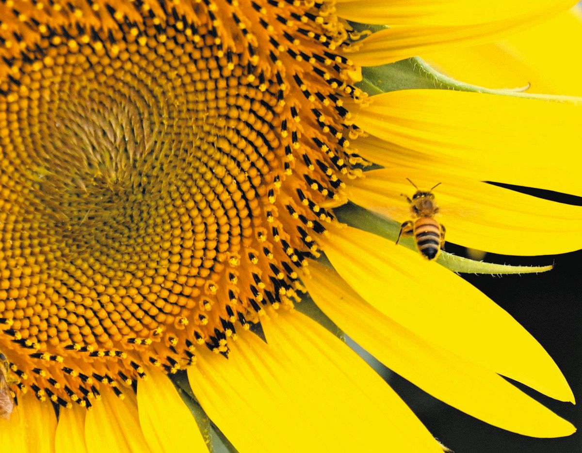 ヒマワリ畑で蜜を集めるミツバチ。清瀬を象徴する名コンビだ=清瀬市で