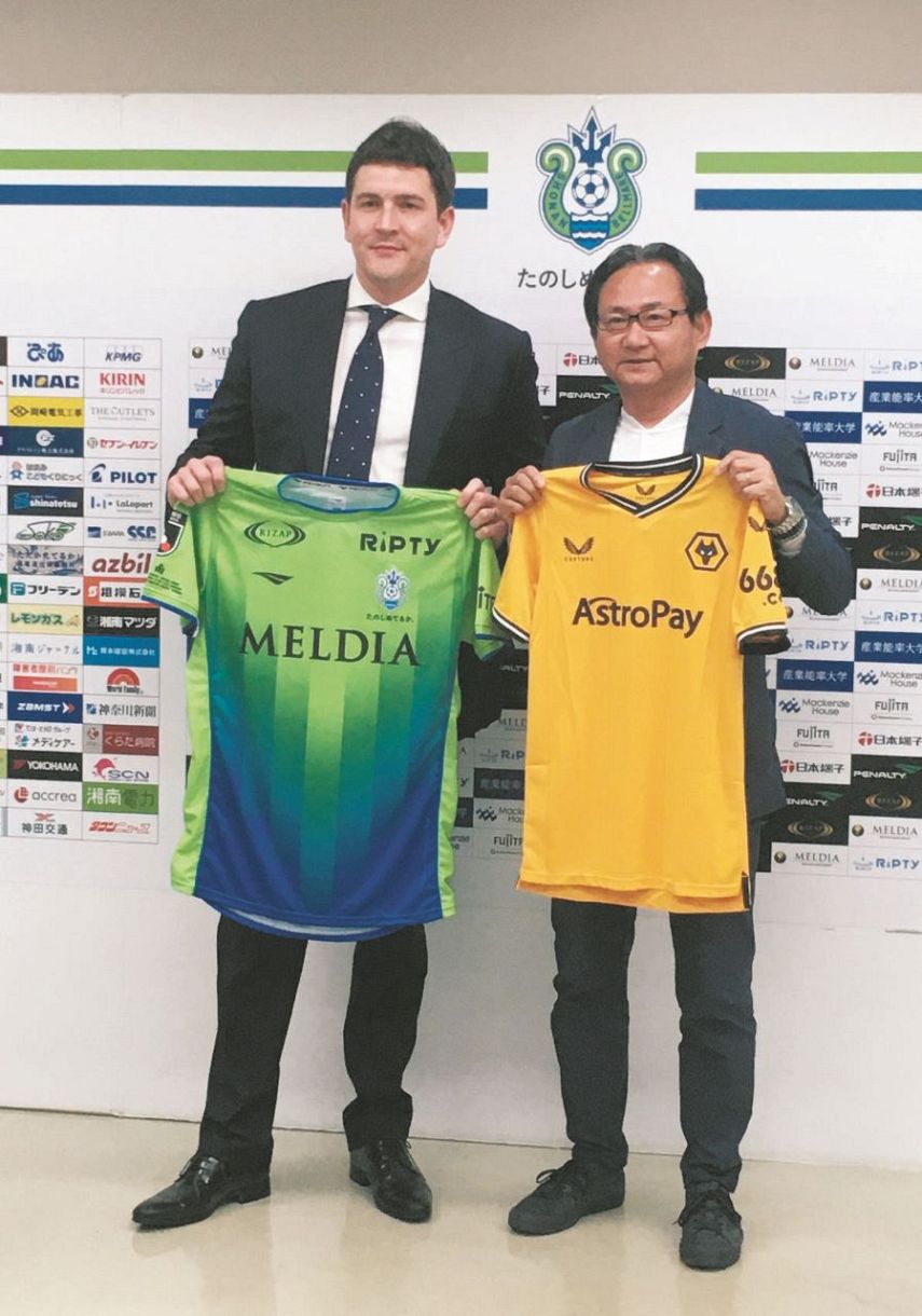4月にイングランド・プレミアリーグのウルバーハンプトンとパートナーシップ締結し、ユニホームを交換する湘南の真壁潔会長(右)