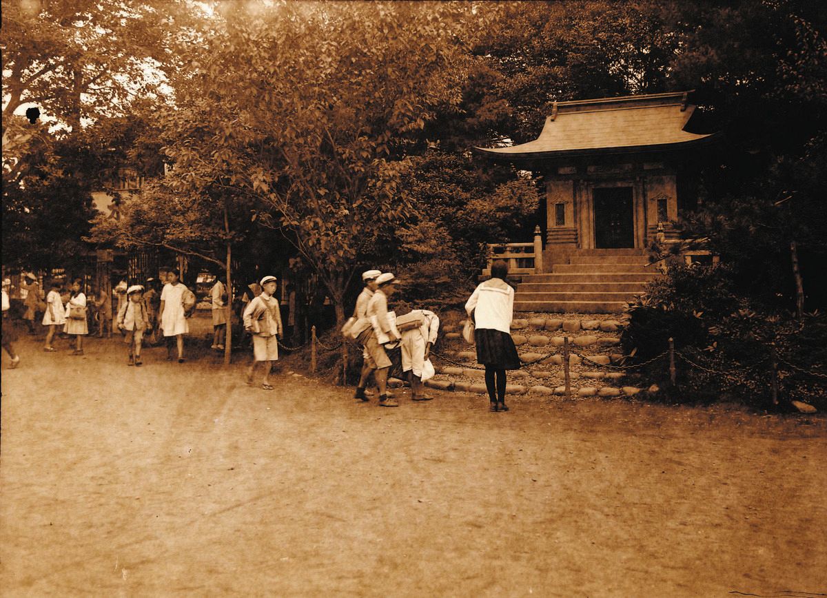 奉安殿に最敬礼をする子どもたち=目黒区で(1933年ごろ撮影、めぐろ歴史資料館提供)