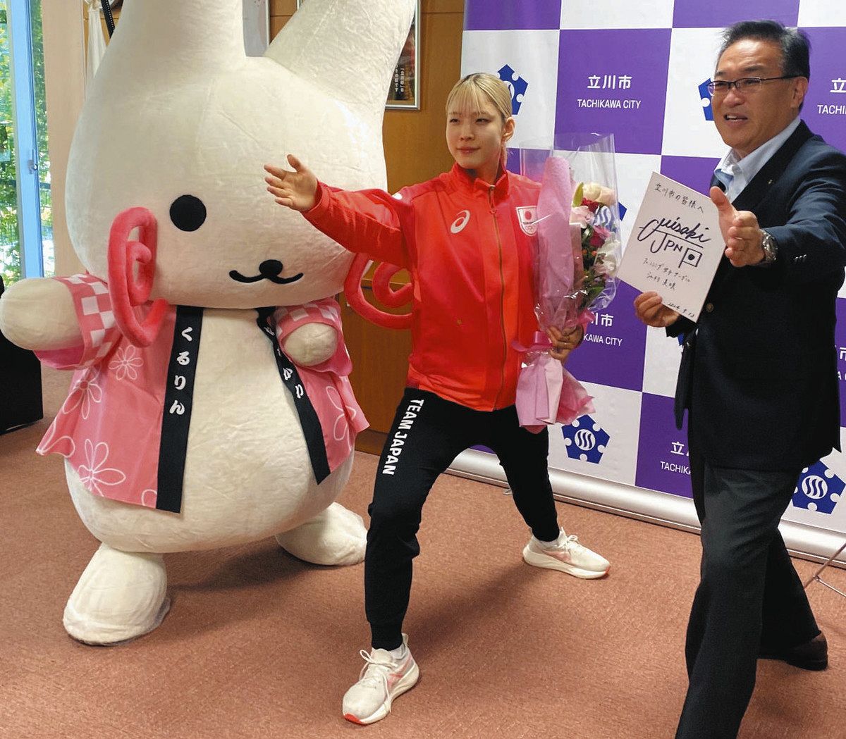 パリ五輪のフェンシング女子サーブル団体で日本初の銅メダルを獲得した立飛ホールディングス(東京都立川市)所属の江村美咲さん(25)=板橋区=が13日、立川市役所を訪れ、酒井大史市長にメダル獲得を報告した。今後について「フェンシングの魅力を広めていく活動をしていきたい」と話した。(松島京太)