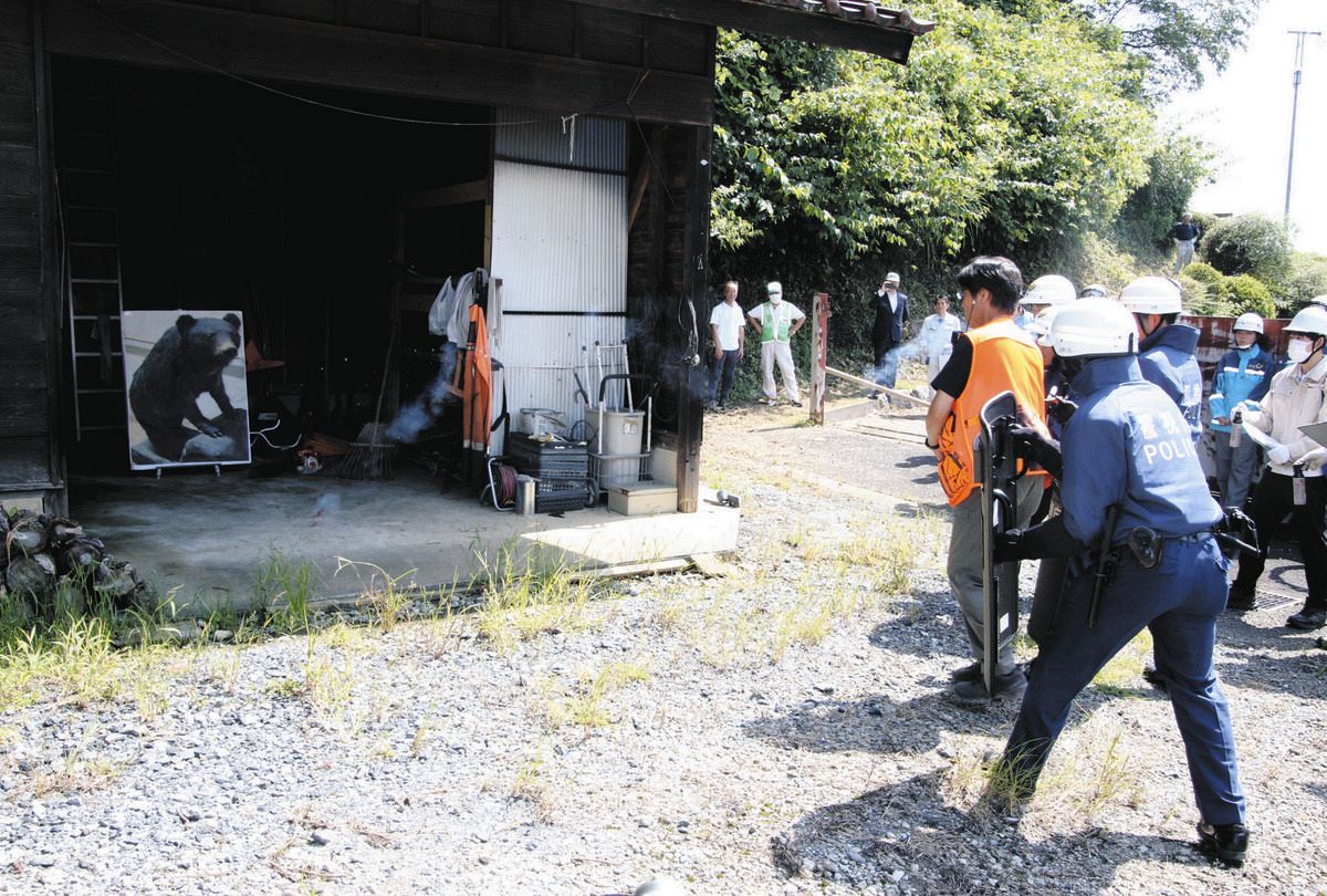 クマが倉庫に逃げ込んだと想定し、追い払う訓練をする猟友会のメンバーや警察官ら=6日、東京都あきる野市で