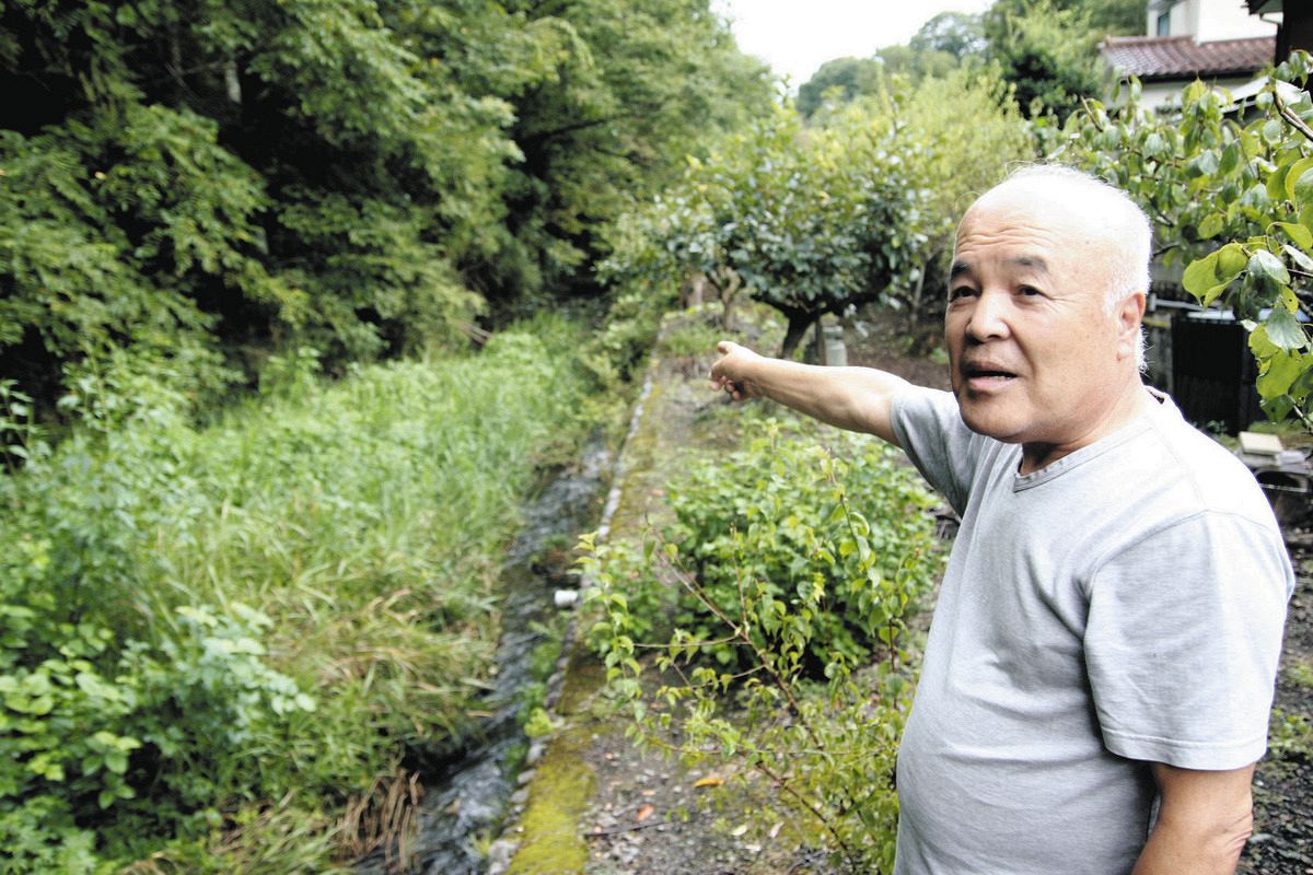 自宅脇の川沿いで、クマがいた場所を指さす須崎さん=東京都あきる野市で