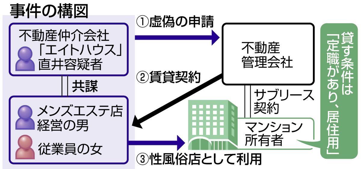 今回、物件のオーナーは貸し出す条件を「定職があり、住居として使う人」としていた。だが、性風俗店舗用の物件を求められた直井容疑者は、女が会社員だと偽装した証明書を準備。紹介手数料と合わせて男から約12万円を得ていた。同物件では7月末まで、約90回にわたり違法な性的サービスが提供されたという。
