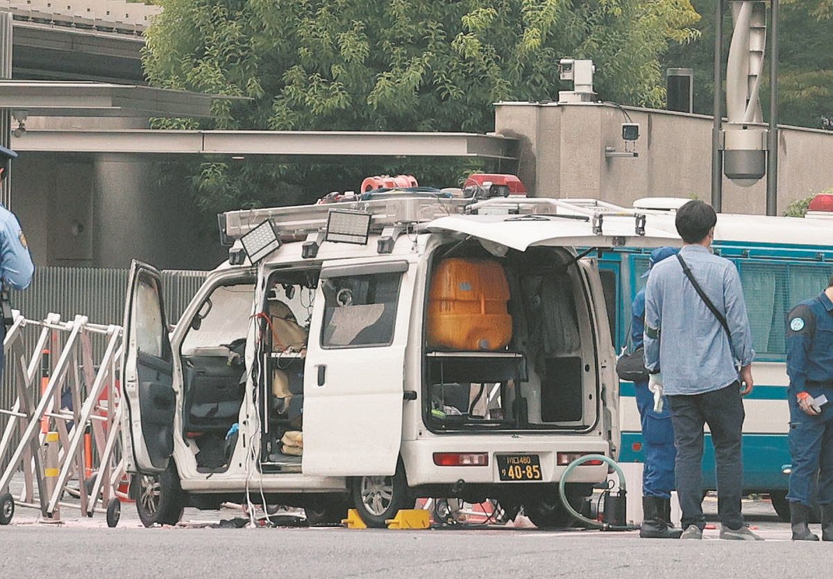 車内からは複数のポリタンクと火炎瓶が見つかった。火炎瓶は手製とみられ、ガラス瓶の中の液体に布が浸され、側面に着火剤が巻き付けられていた。車内に燃えた跡があり、臼田容疑者が警察官に発煙筒を投げ付けた後、車内の発火物に火を付けたとみられる。