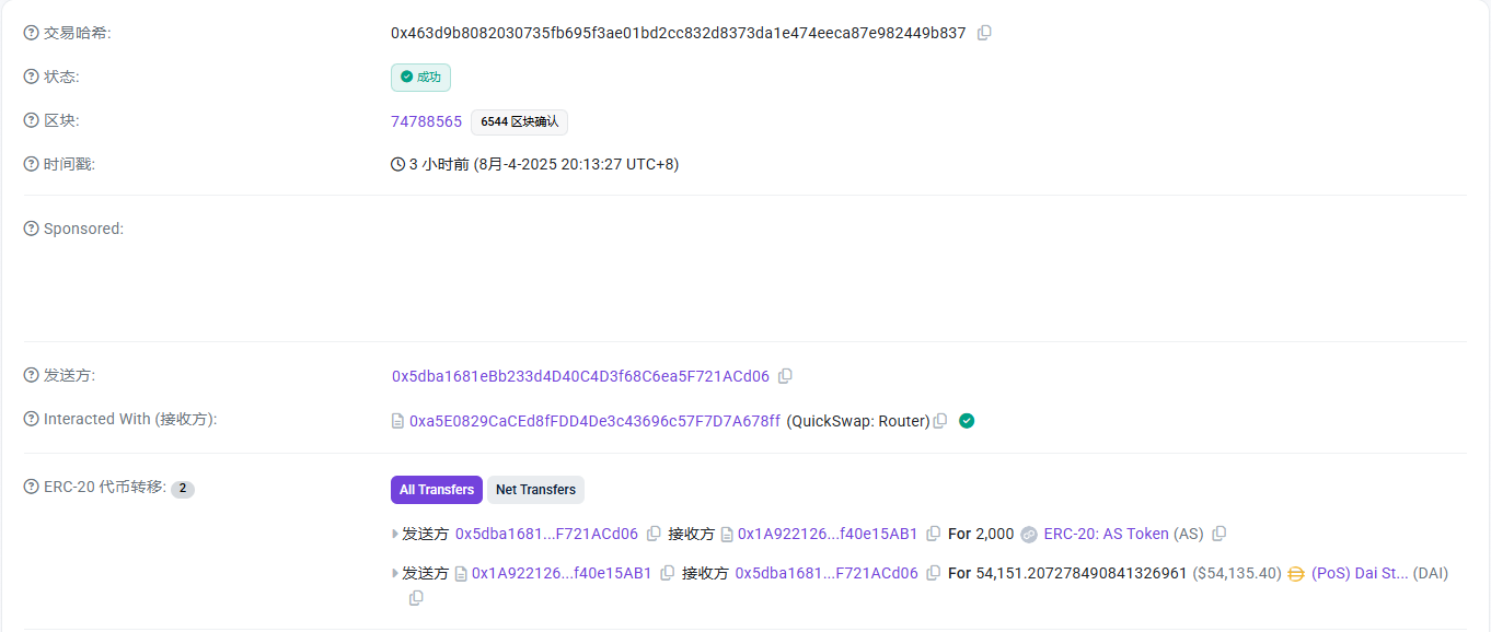 流動性の集中も大きなリスクです。Polygon 上の AS(AKAS トークン、0x6a92…b26e)は QuickSwap の単一 AS/DAI プールでほぼすべて取引されます。オンチェーンデータは短期出来高・TVL・FDV が1つのプールに集中していることを示します。天気が良ければ安定して見えますが、薄氷の上の安定です。ウォレット 0x5dba…ACd06 がこのプールと頻繁にやり取りし、大規模な DAI→AS スワップを繰り返しています。つまり、市場の命綱がごく少数の手に握られています。