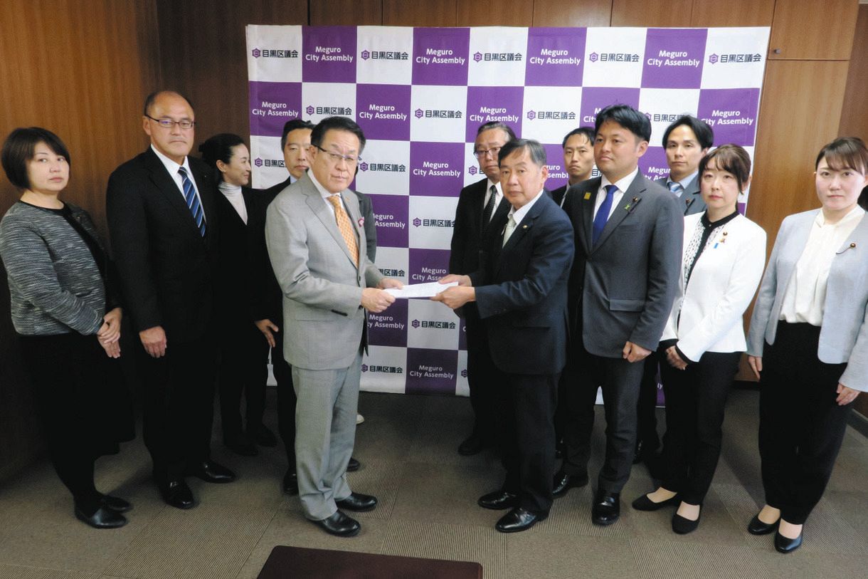 青木英二区長(前列、左から3人目)に申し入れを手渡す鈴木理志議長(青木区長の右隣)ら=目黒区役所で