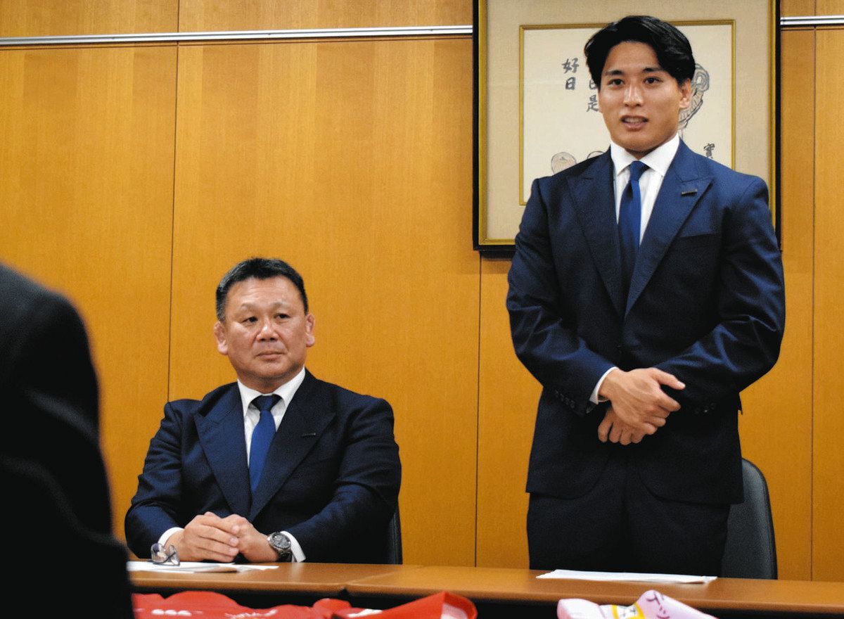 リーグ3連覇への意気込みを語る浜田選手(右)と薫田社長=調布市で