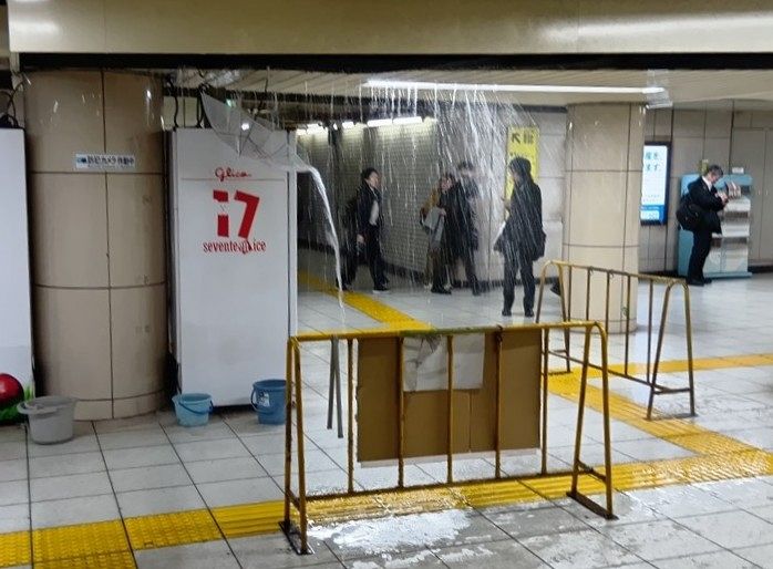 14日午後6時ごろ、千代田区の東京メトロ丸ノ内線霞ケ関駅の日比谷公園方面の改札付近で、天井から大量の漏水があった。給水管が破損した可能性があるという。