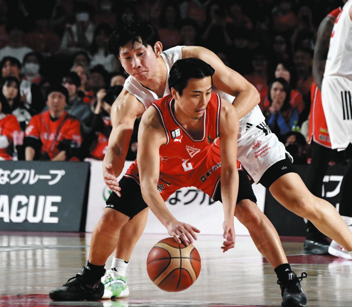 千葉JーA東京千葉Jの富樫から必死にボールを奪おうとするA東京の小酒部(奥)=8日、千葉県船橋市のららアリーナ東京ベイで