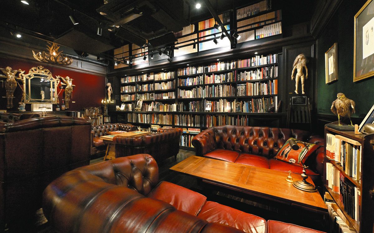 重厚な扉をゆっくり開けると、妖しい空間が広がっていた。照明を落とした室内に赤い革のビンテージソファが映える。金の調度品、人形が壁一面の本と相まって、独特の雰囲気を醸し出す。ここは銀座5丁目。地下に造られた秘密のバーである。