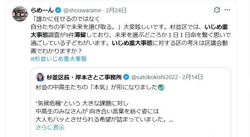 「杉並区では、いじめ重大事態調査が9件滞留しており、未来を選ぶどころか1日1日命をつなぐ思いで過ごしている子どもがいます」
