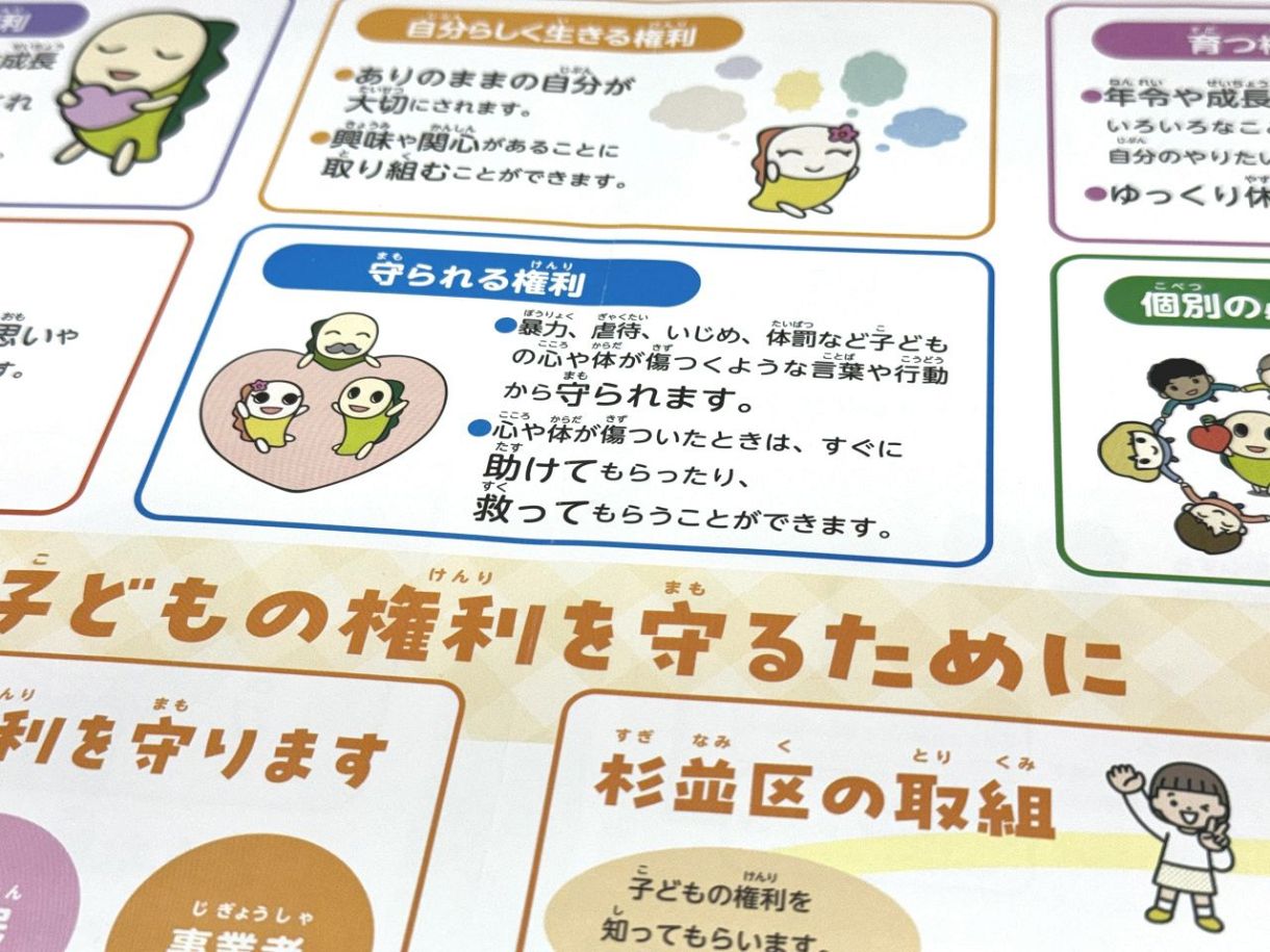 杉並区が作成する「区子どもの権利に関する条例」のパンフレット。いじめなどから守られる子どもの権利が紹介されている