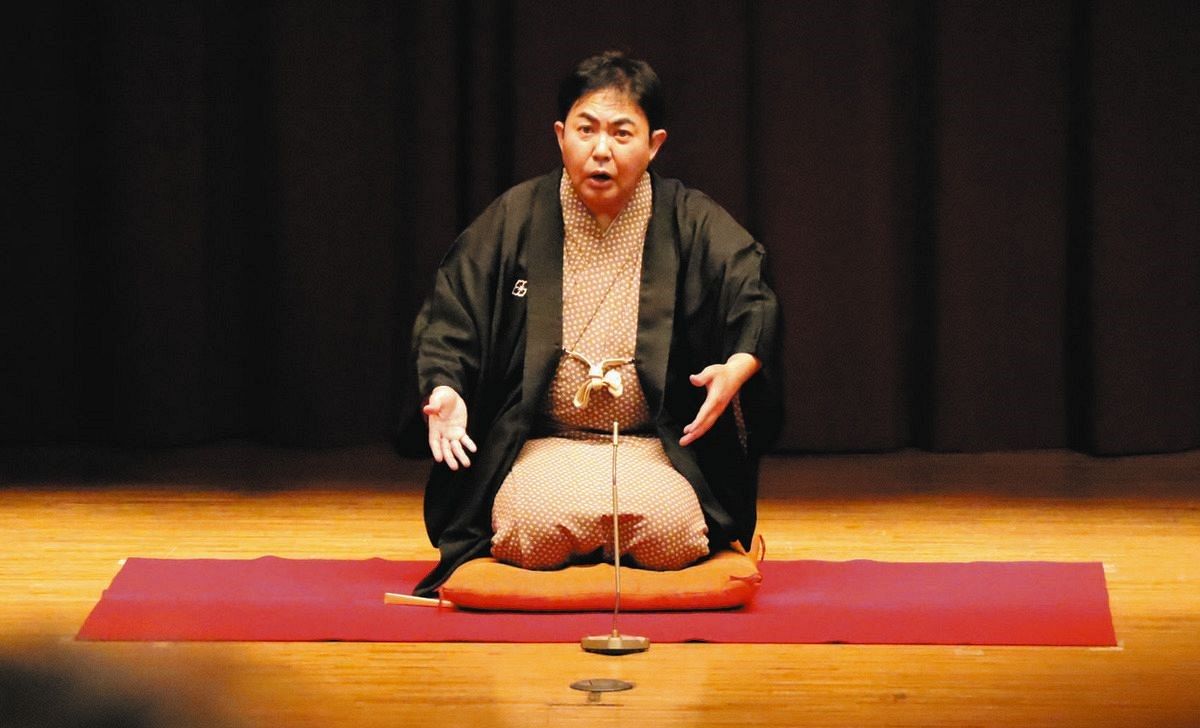 国策落語を披露した林家三平さん=8日、東京都江東区で