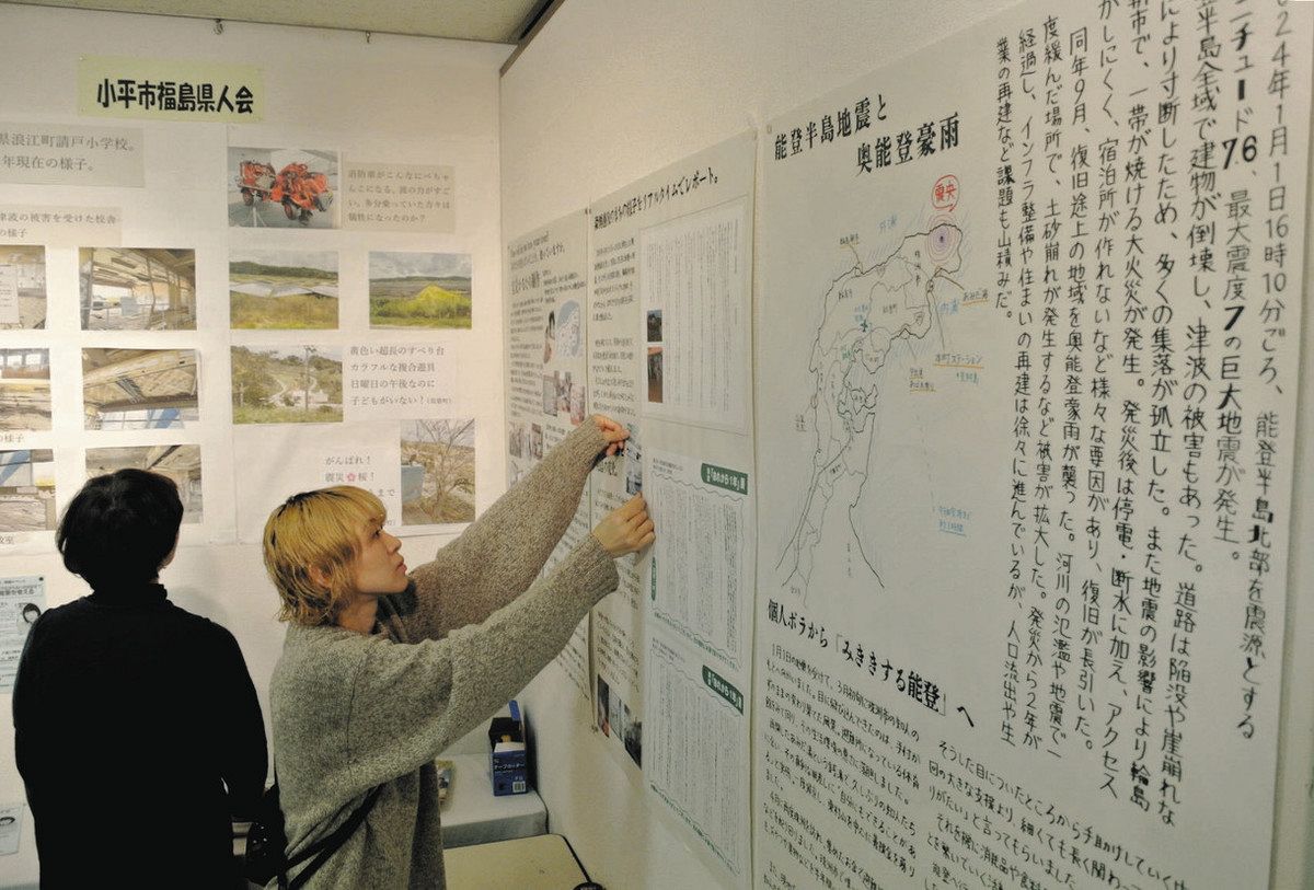 展示会は、震災翌年の2012年に市中央公民館が始め、途中から市民有志の実行委員会が引き継いで主催している。小平市福島県人会や、災害用井戸の普及に取り組むNPO法人「小平井戸の会」、自治会、企業など26団体が参加。写真や関連資料で、それぞれの取り組みや防災に役立つ情報を紹介している。