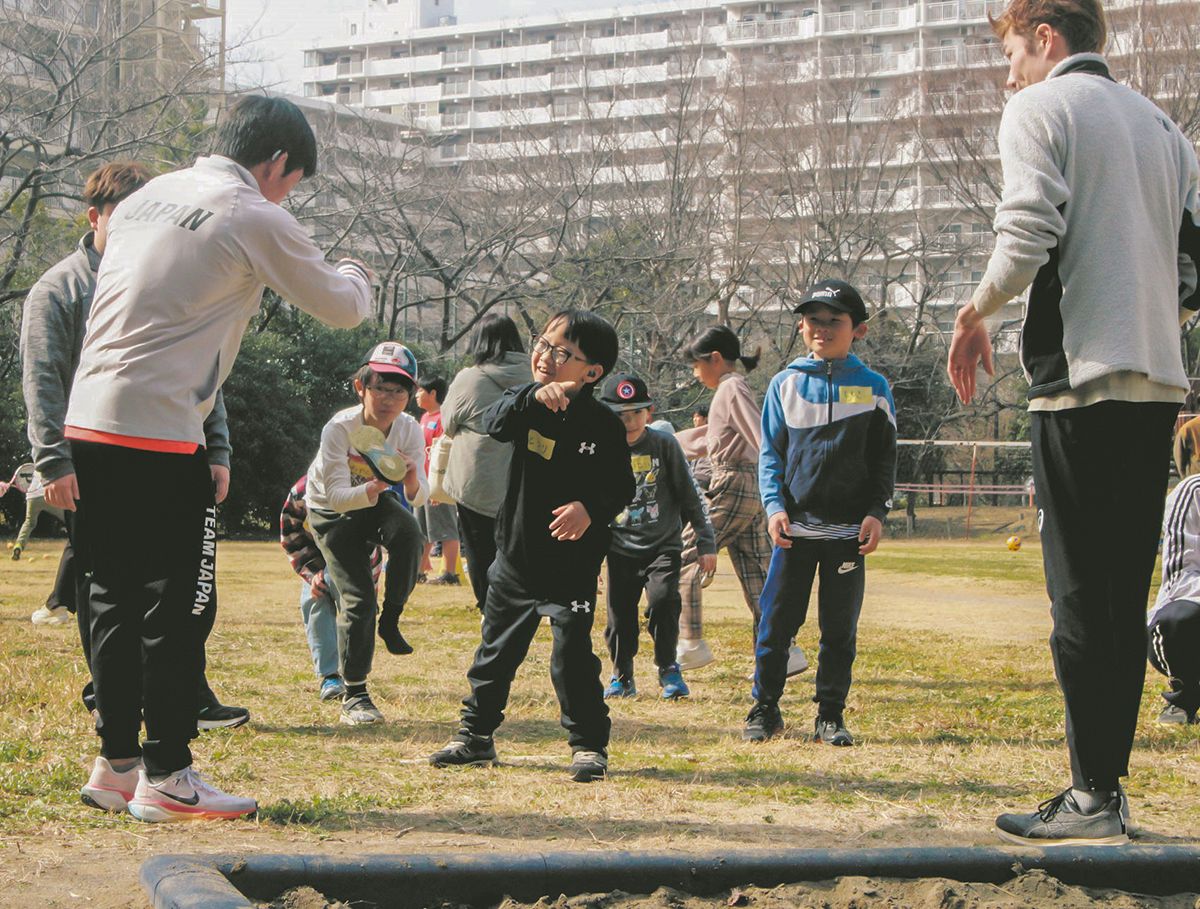 日本代表選手(左)と手話でやり取りしながら体を動かす子どもたち=東京都品川区で