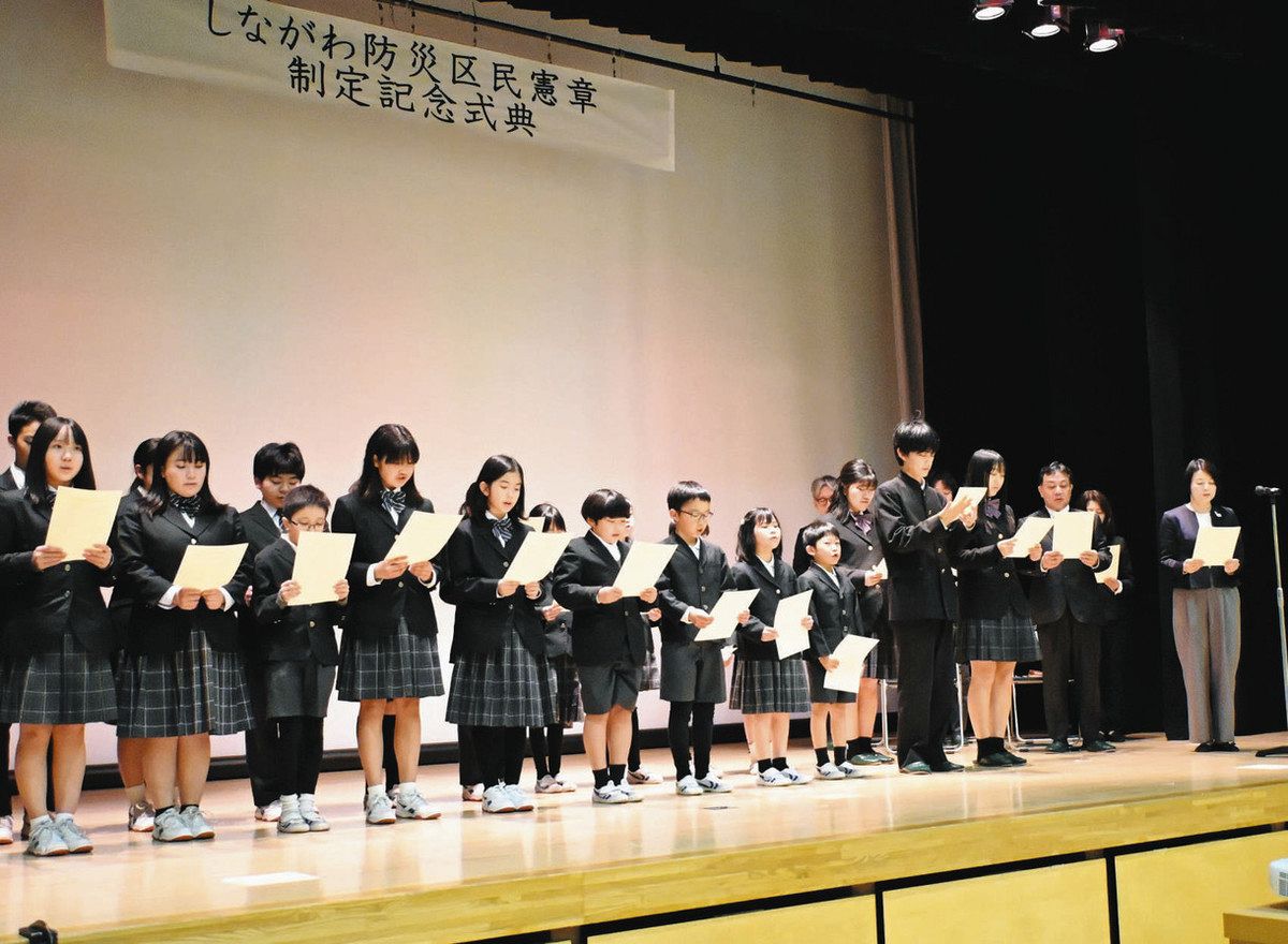 「防災区民憲章」を唱和する児童生徒と森沢恭子区長(右端)ら=品川区で