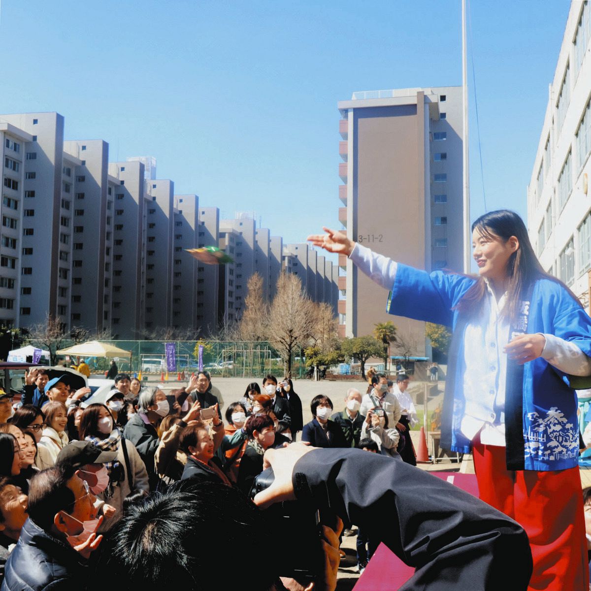 菓子をまいたシンガー・ソングライターの飯島美月さん(30)=板橋区=は、5年生の終わりに閉校するまで高七小に通い「児童数が少ないから特別支援学級の子も一緒に学んだ。高七小の子は思いやりがある」と振り返った。