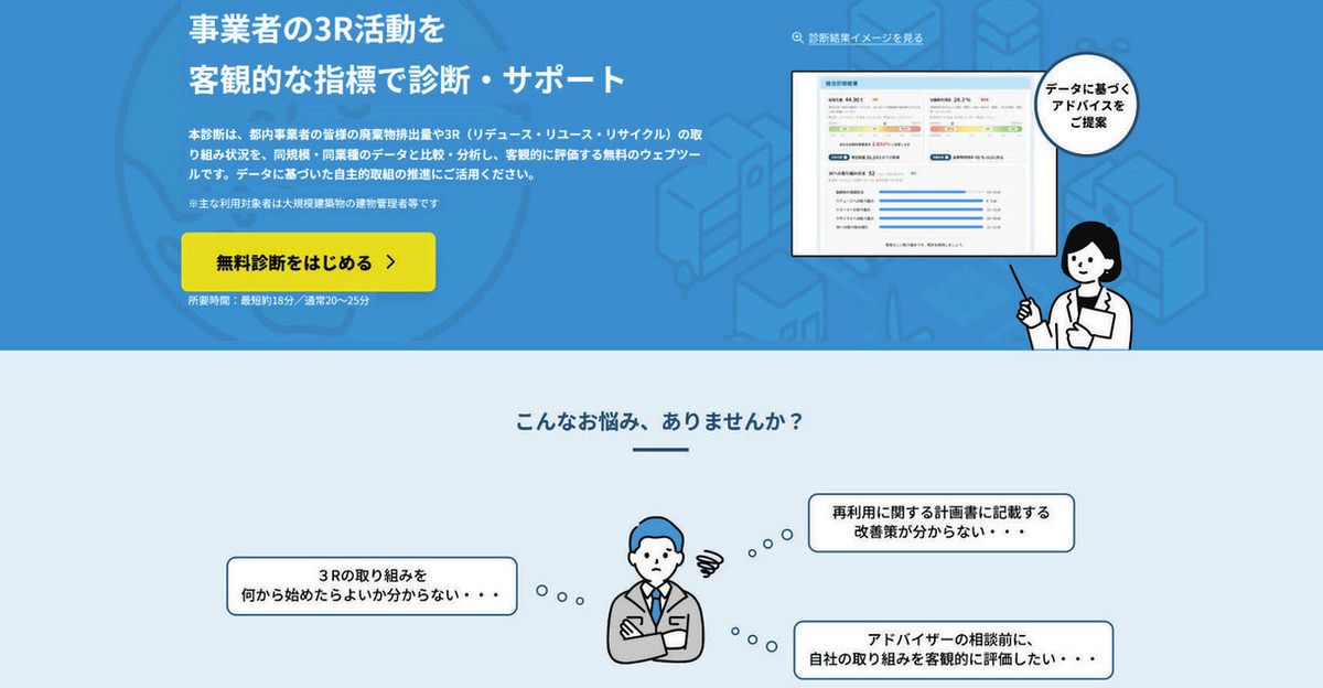 東京都は1日、事業所が自社のごみ減量やリサイクルの取り組み状況を手軽に診断できるオンラインツール「TOKYO 3R診断ナビ」を公開した。都内事業所のデータ約1万件を取り込んでおり、同業種、同規模の事業所と比べたリデュース(発生抑制)、リユース(再利用)、リサイクルの3Rの進み具合や課題などを把握することができる。