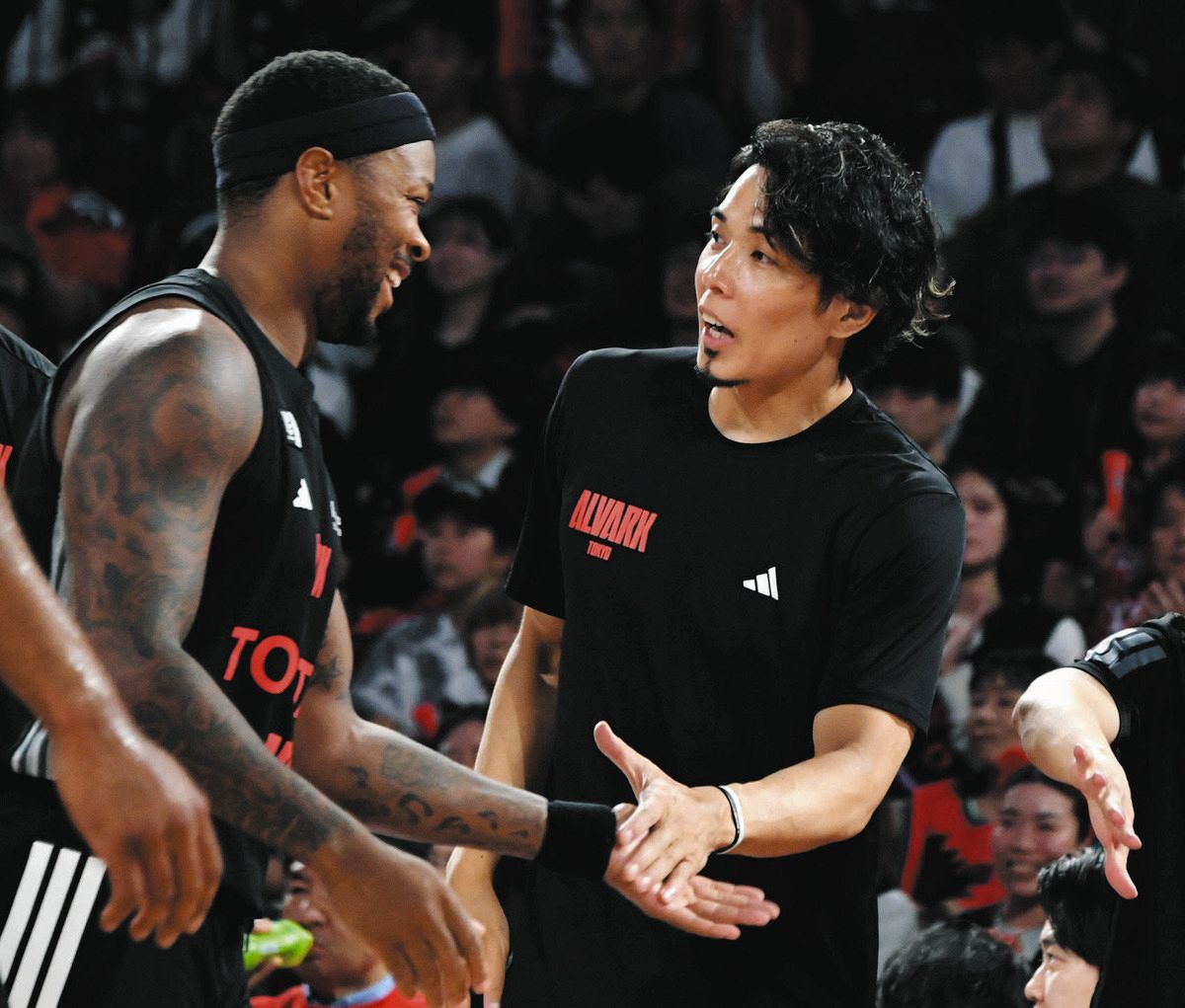 A東京-島根3点シュートを沈め、相手にタイムアウトを取らせたフォスターを笑顔で迎えるA東京の菊地(右)=12日(渡邉陽太郎撮影)